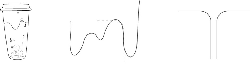 The parallel partitions connected to the celling referred to the curves that randomly-formed alongside the cup by the flowing white soft Cheezo cream whenever people take a sip of the Cheezo Tea.